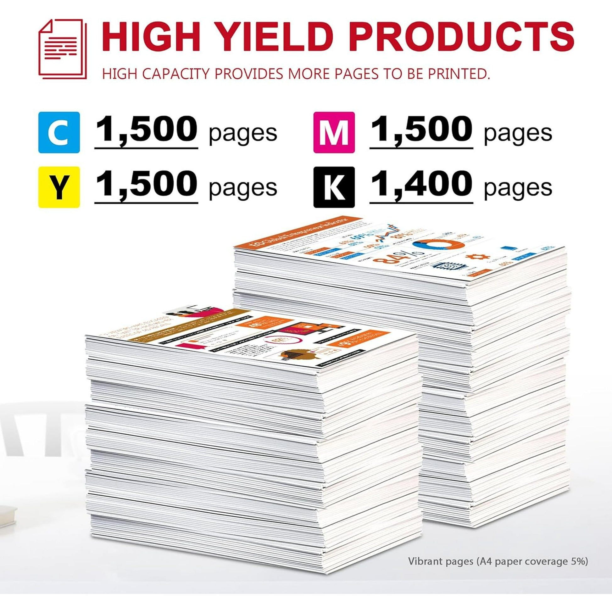 - This bundle contains up to 5, 900 pages of yield (1,400 Pages Per Black Toner Cartridge 1,500 Pages Per Color Toner Cartridge, Letter/A4, at 5% coverage)